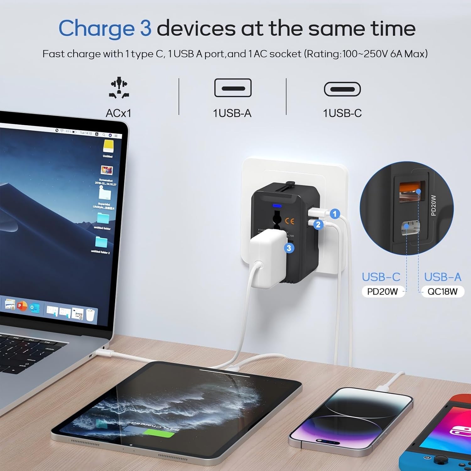 [20W Fast Charging for Popular Smart Devices ] Features efficient fast-charging tech, delivering better power transmission than traditional chargers. Equipped with 1 USB-C PD port, 1 USB-A port, and 1 AC outlet (max 660W at 110V / max 1440W at 250V), it’s compatible with mainstream fast-charging protocols. The USB-C port supports 20W fast charging—charges iPhone 16 from 0 to over 50% in 30 minutes. Perfect for quickly topping up phones, tablets, and more during travel, cutting down charging wait time significantly. Ideal as a multi-port travel charger.