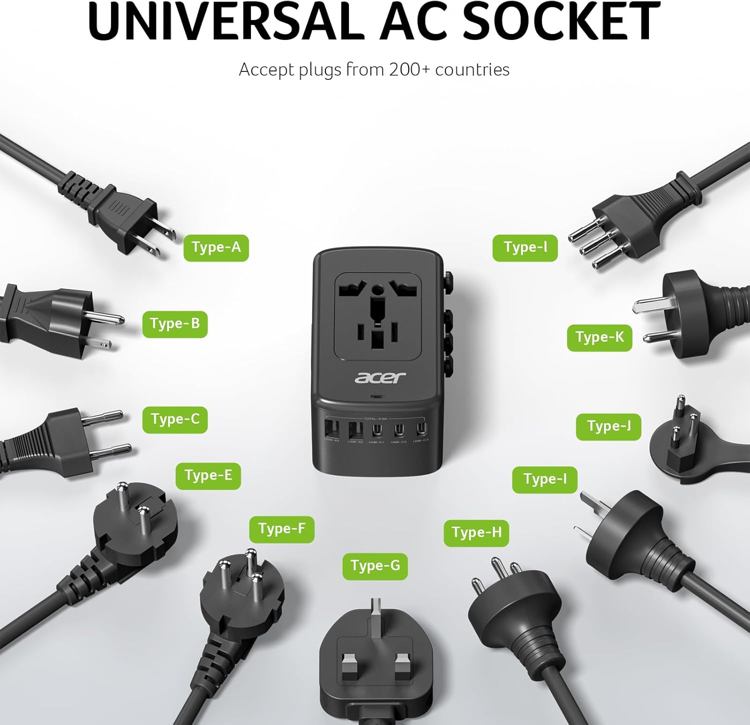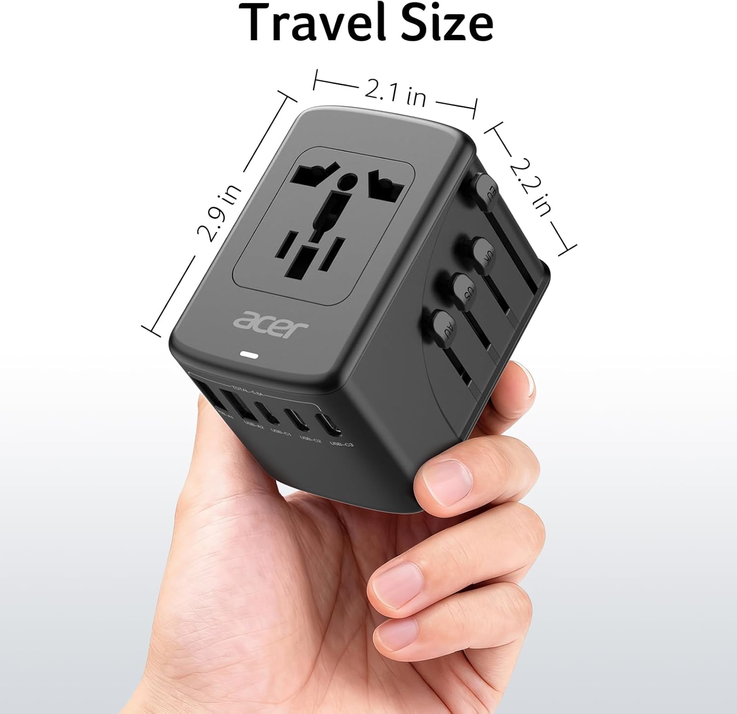 【6-in-1 Universal Travel Adapter】 This international power adapter has 5 USB ports(29W) and a universal AC outlet which accpet plugs of US, EU, UK, AU, so you can simultaneously charge 6 of your electronics such as iPhones, laptops, tablets, power banks, cameras, earbuds. This travel adapter worldwide ensures seamless connectivity on your worldwide adventures.