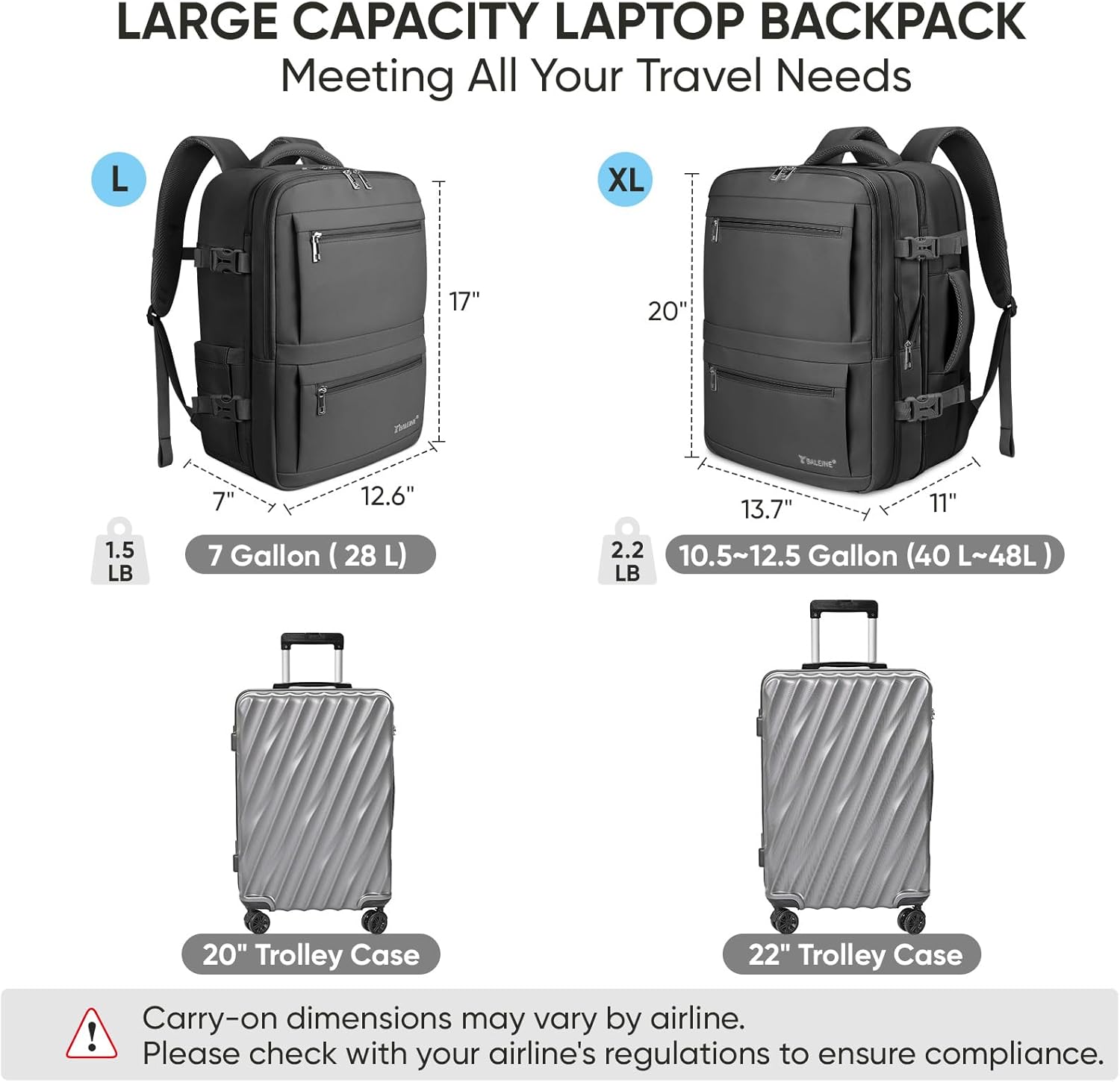 Large Capacity: The travel laptop backpack comes in two sizes: L (17″x12.6″x7″), weighing 1.5 lb, with a 28 L capacity, and XL (20″x13.7″x11″), 2.2 lb, 40 L capacity, expandable to 48 L; This backpack for travel offers well-organized compartments for your laptop, books, wallet, clothing, and other essentials; The multi-pocket design ensures that your items are organized and easily accessible