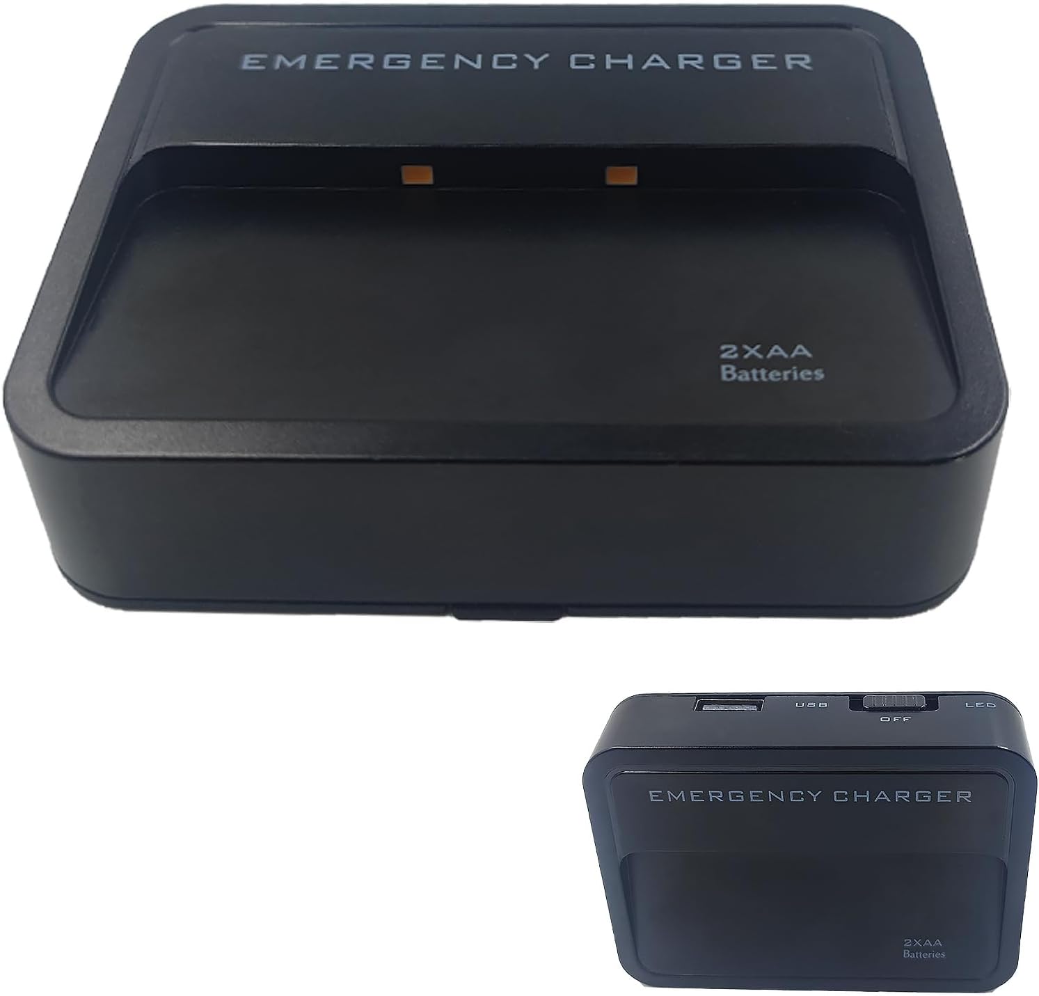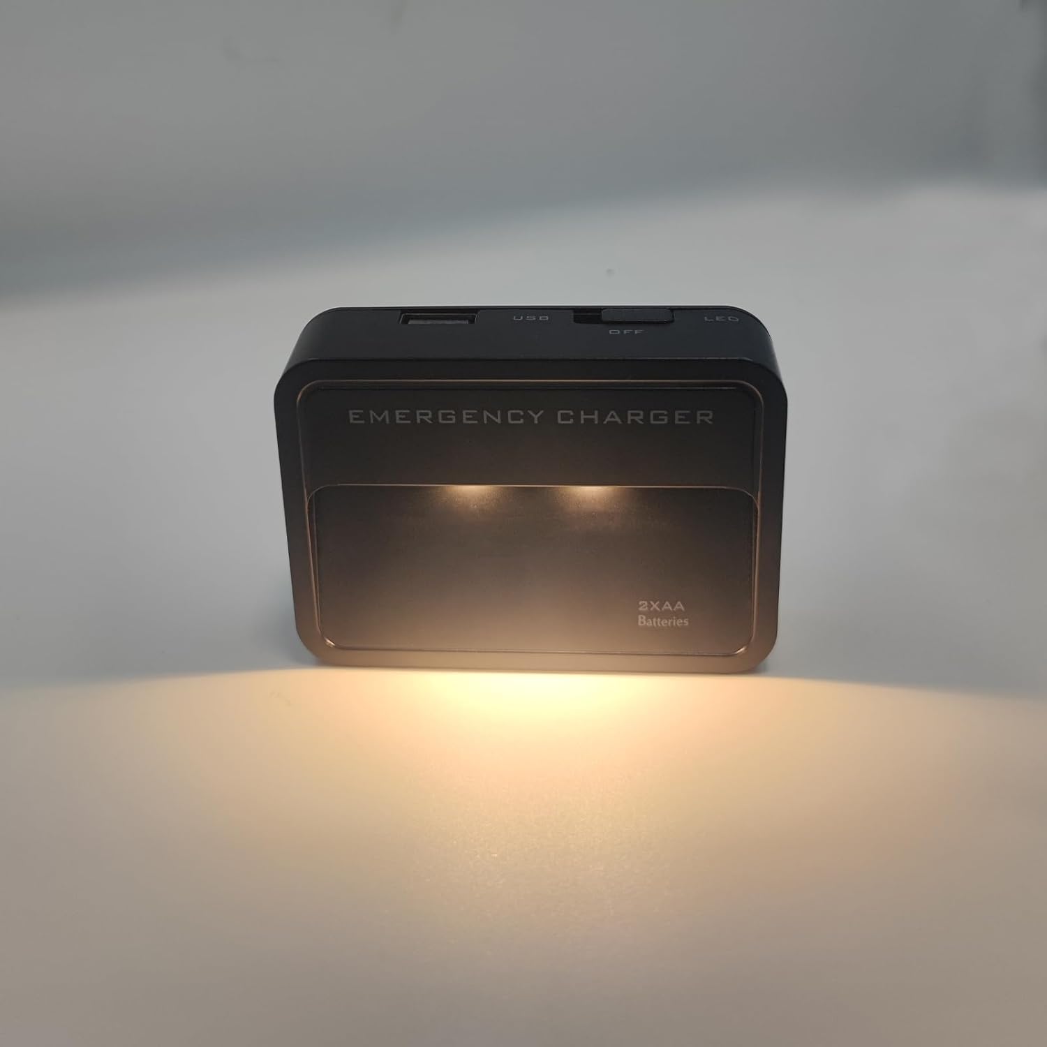 This compact and portable emergency USB power bank charges mobile devices with 2 AA batteries.