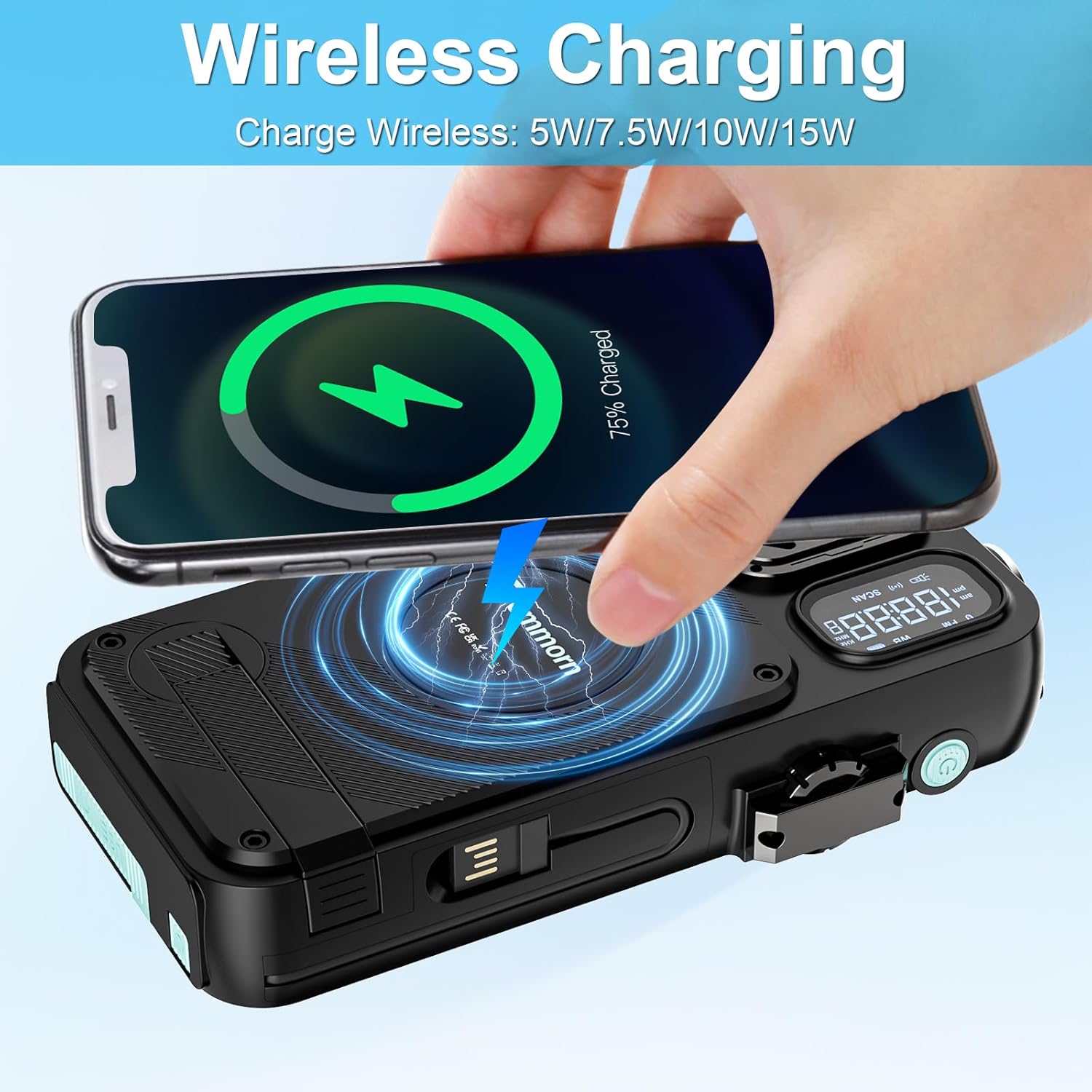 Advanced Wireless Charging: This solar battery charger utilizes the latest wireless charging technology, compatible with all Wireless-enabled mobile devices. Such as iPhone 8-16, Samsung Galaxy S6-S23 / Note5-Note20, etc. Put your device on the wireless charging area, it gets charged immediately. Come and enjoy your cable-free charging time.