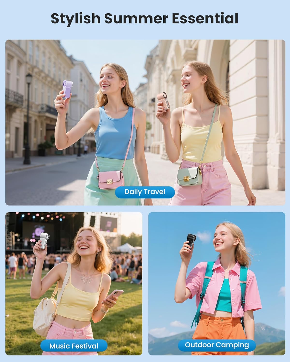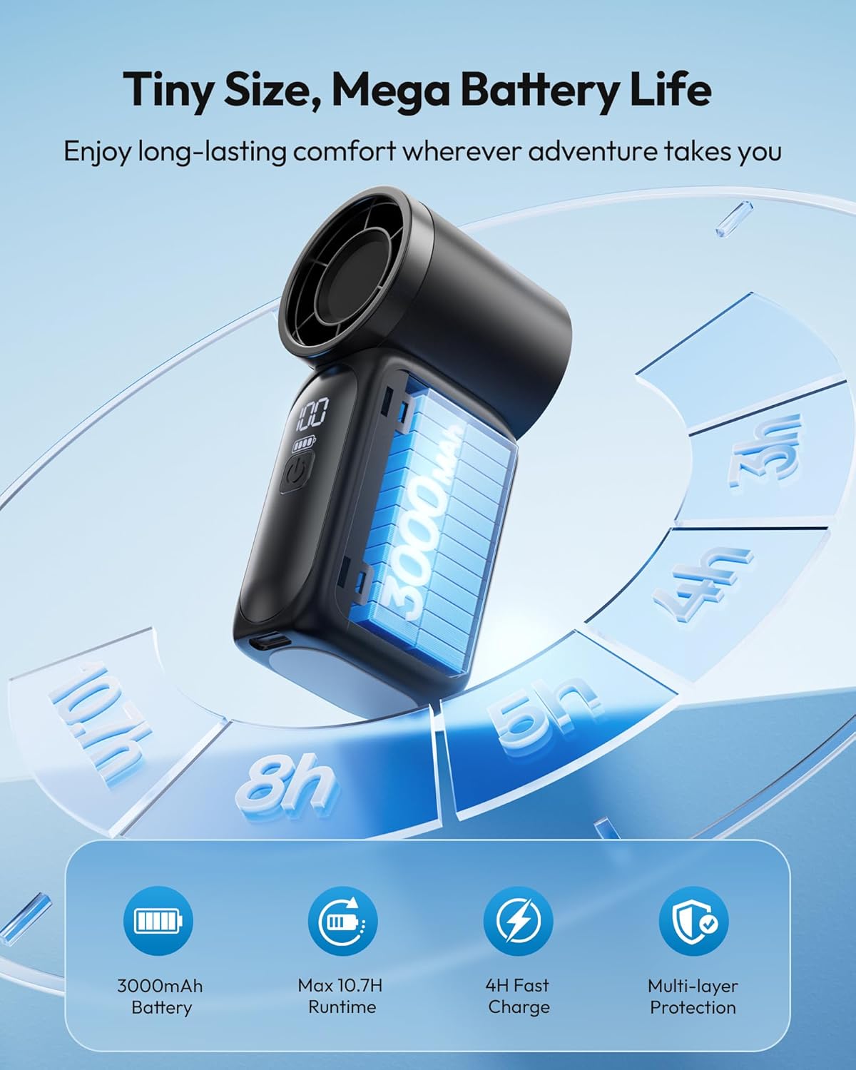 Long-Lasting 3000mAh Battery Portable Fan: Get up to 10.7 hours of cooling on one charge. This USB-C rechargeable fan works with power banks, laptops, or wall adapters, making it a reliable battery operated fan for trips, festivals, or daily commutes