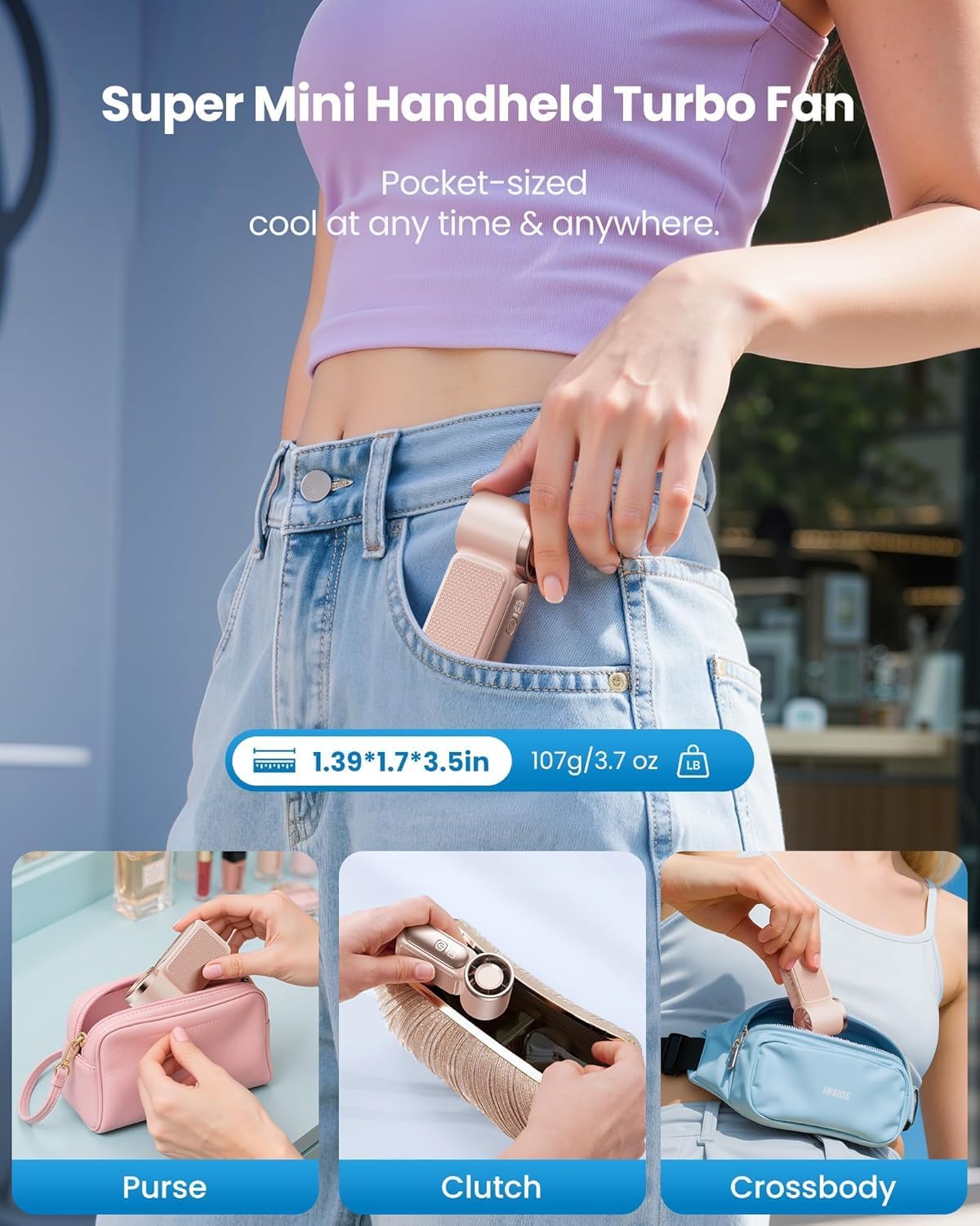 Ultra-Portable & Truly Pocket-Sized Mini Fan: Weighing only 107g, this ultra-compact personal fan fits effortlessly in your pocket, purse, or clutch. Includes a detachable lanyard for totally hands-free wear—ideal for travel, commutes, and outdoor use. A true portable mini fan that goes everywhere you do