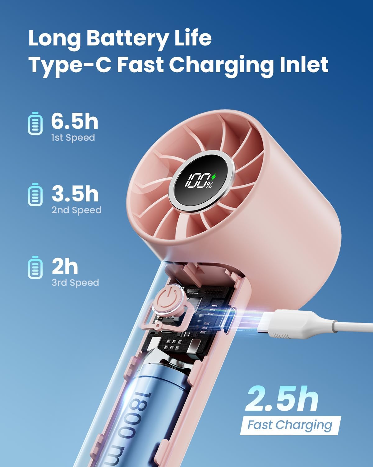 1800mAh Rechargeable Battery: This handheld fan is equipped with a 1800mAh high-quality battery with a 2A fast charging interface that can be quickly fully charged in 2.5 hours, providing 2-7 hours of continuous working time without lighting