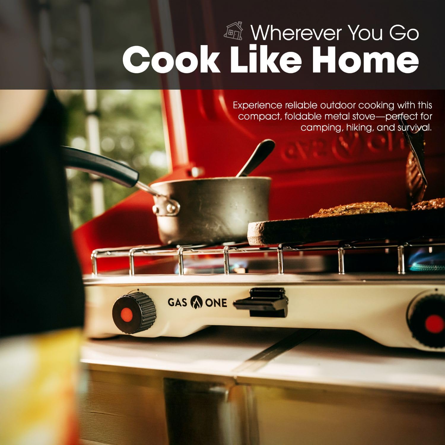 Dual Stove with Adjustable Burners: The GasOne portable stove for camping features two burners that can be independently adjusted, allowing a precise and smooth flame makes outdoor cooking both enjoyable and effective.