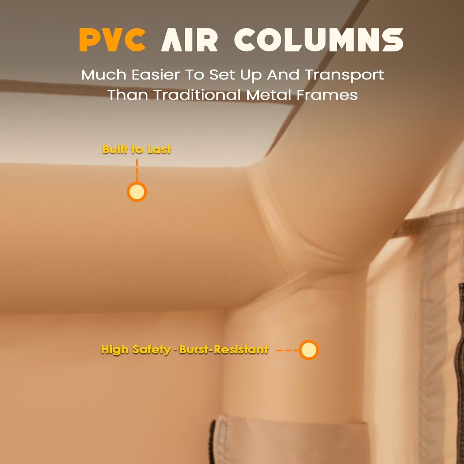 Reinforced TPU Air Beams with Protective Cover: Built with durable TPU air beams for long-lasting support, this air tent offers enhanced stability without the hassle of traditional poles. Each beam is fully wrapped in tough Oxford fabric for added protection against wear and punctures. In case of damage, the zippered design allows for quick and easy replacement—ensuring your adventures never miss a beat.