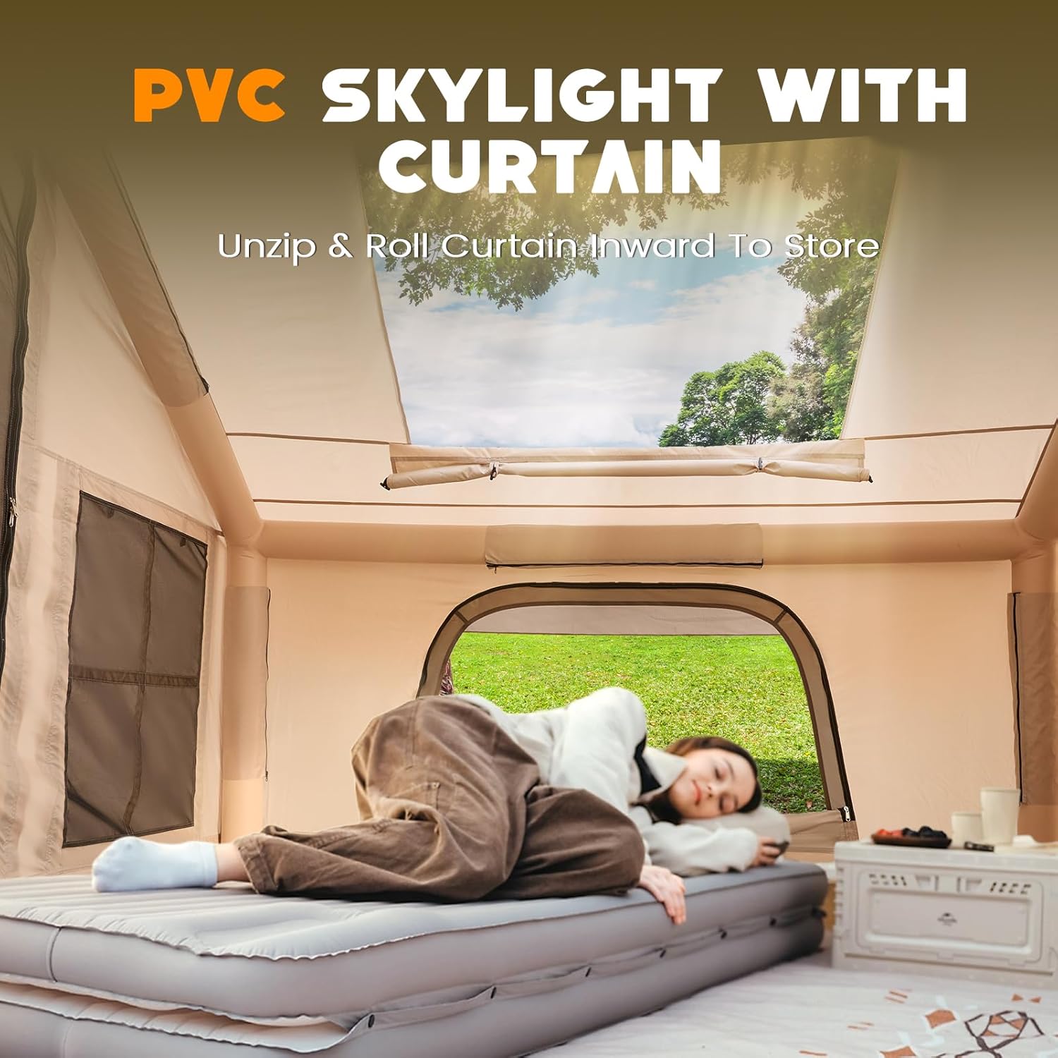 Panoramic PVC Skylight + Optional Privacy Cover: A spacious PVC skylight stretches across one side of the roof, offering a clear view of the sky and surroundings, whether you’re watching passing clouds or stargazing at night. When privacy is needed, simply snap on the included interior curtain to create a calm, enclosed retreat in seconds.