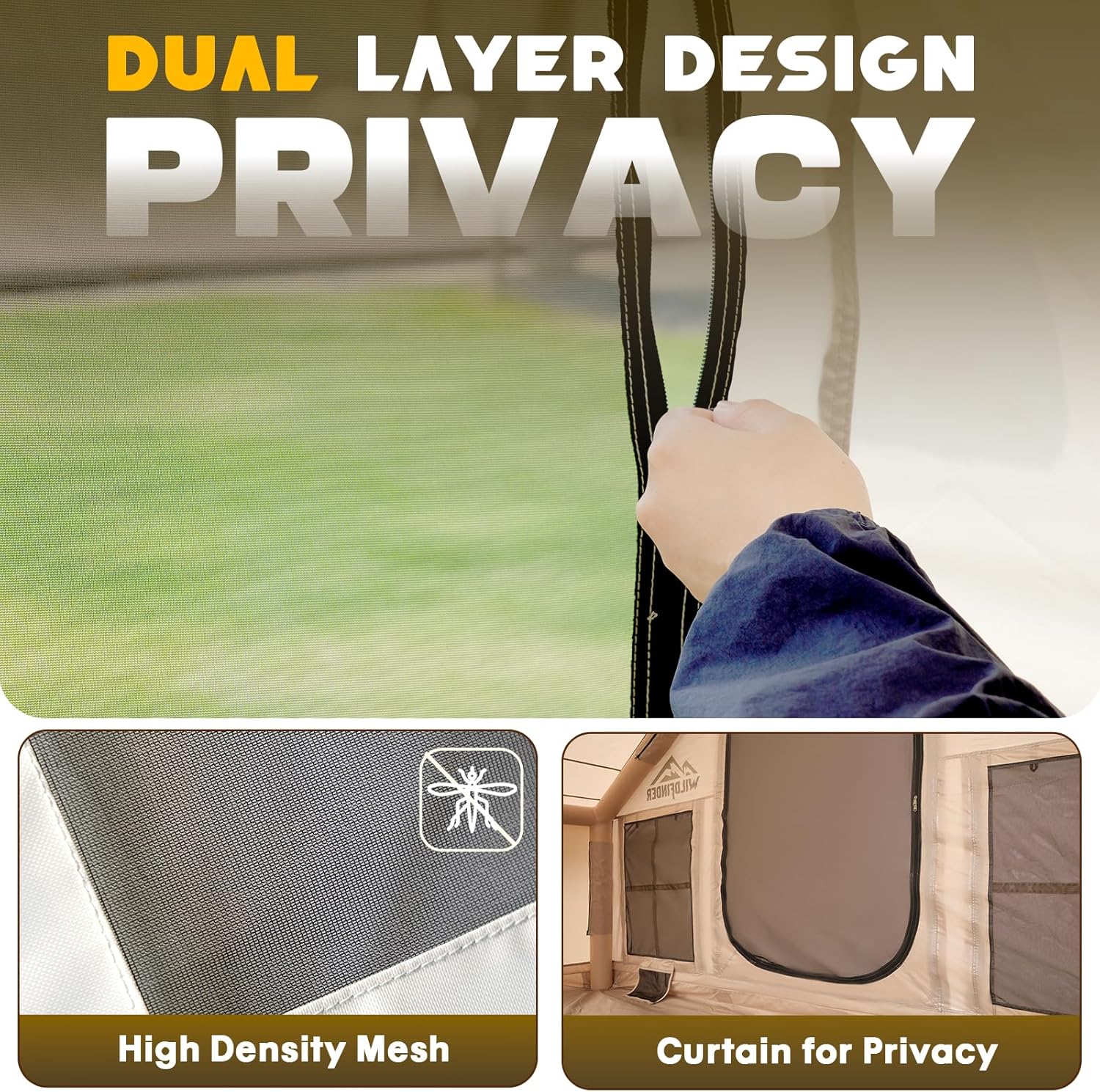 All-Around Mesh for Ventilation & Comfort: Dual doors and mesh windows provide 360° airflow while keeping bugs out. High-density mesh allows fresh air and light in, creating a bright, breathable, and private interior for relaxing or sleeping.