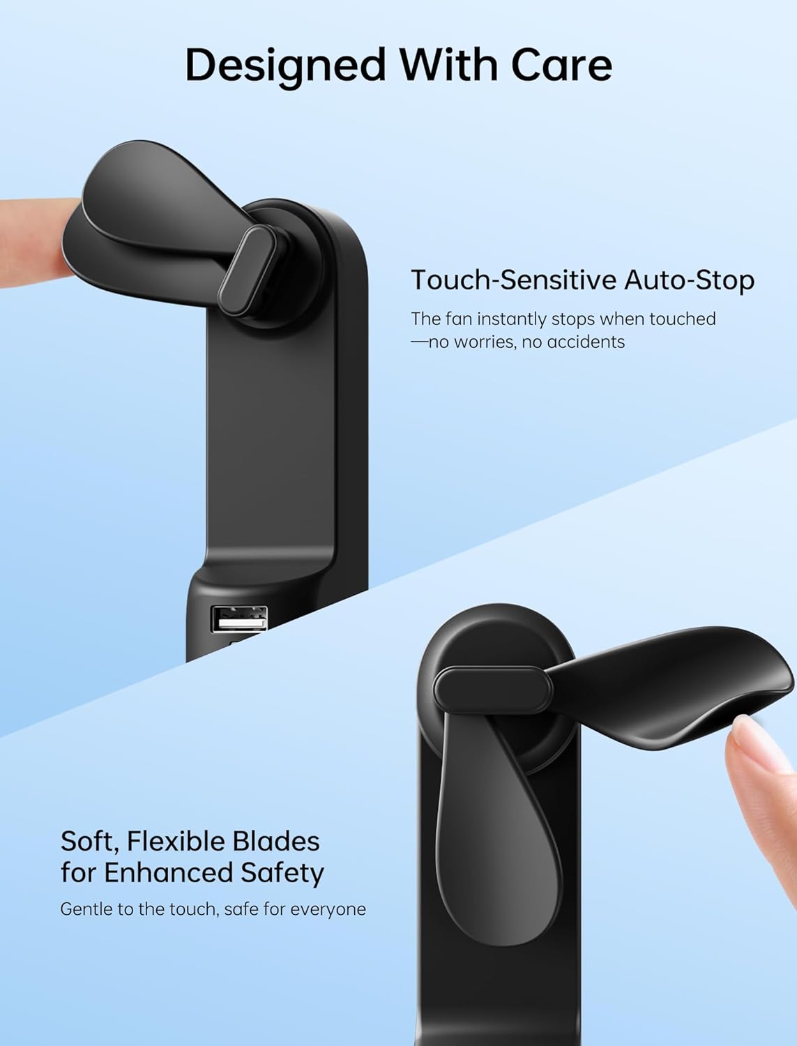 3-Stage Transformable Fan: 3-stage transformable design allows for easy storage with hidden blades, making it compact enough to carry in your pocket; Use it as a handheld fan at 180° fold or as a desktop fan at 270° fold for added versatility