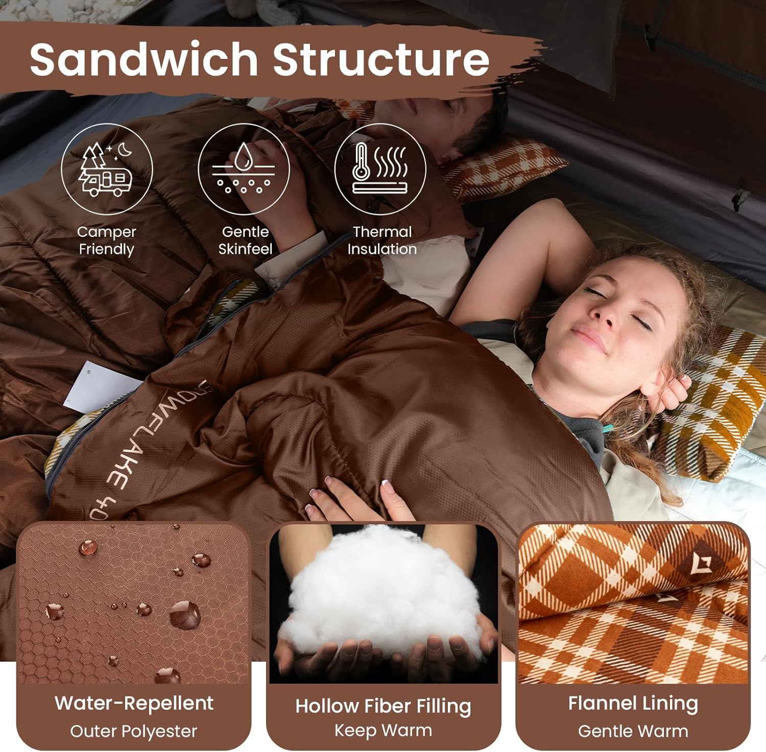 COZY & COMFORTABLE-Cloud-Like Softness for a Restful Night: Experience unmatched comfort with our double-filled sleeping bag. Designed to keep you cozy and warm after a long day of outdoor activities, this bag features a plush flannel liner that feels like a cloud against your skin. The double-layer insulation offers exceptional warmth, ensuring that you stay comfortable throughout the night. Whether you’re camping, hiking, or relaxing, this sleeping bag will provide the perfect retreat.