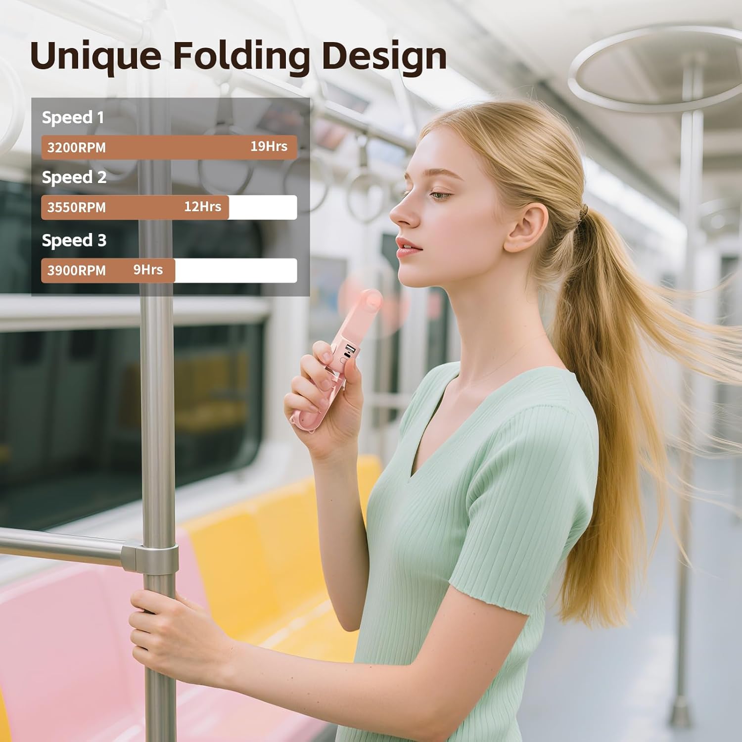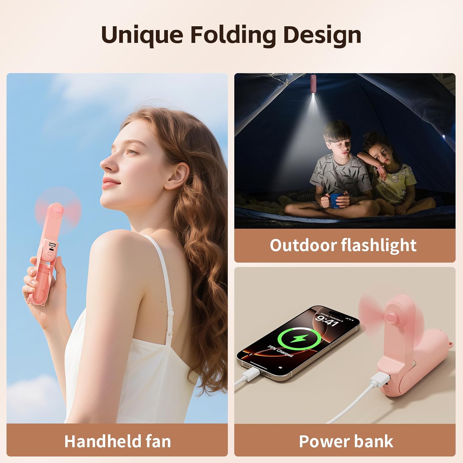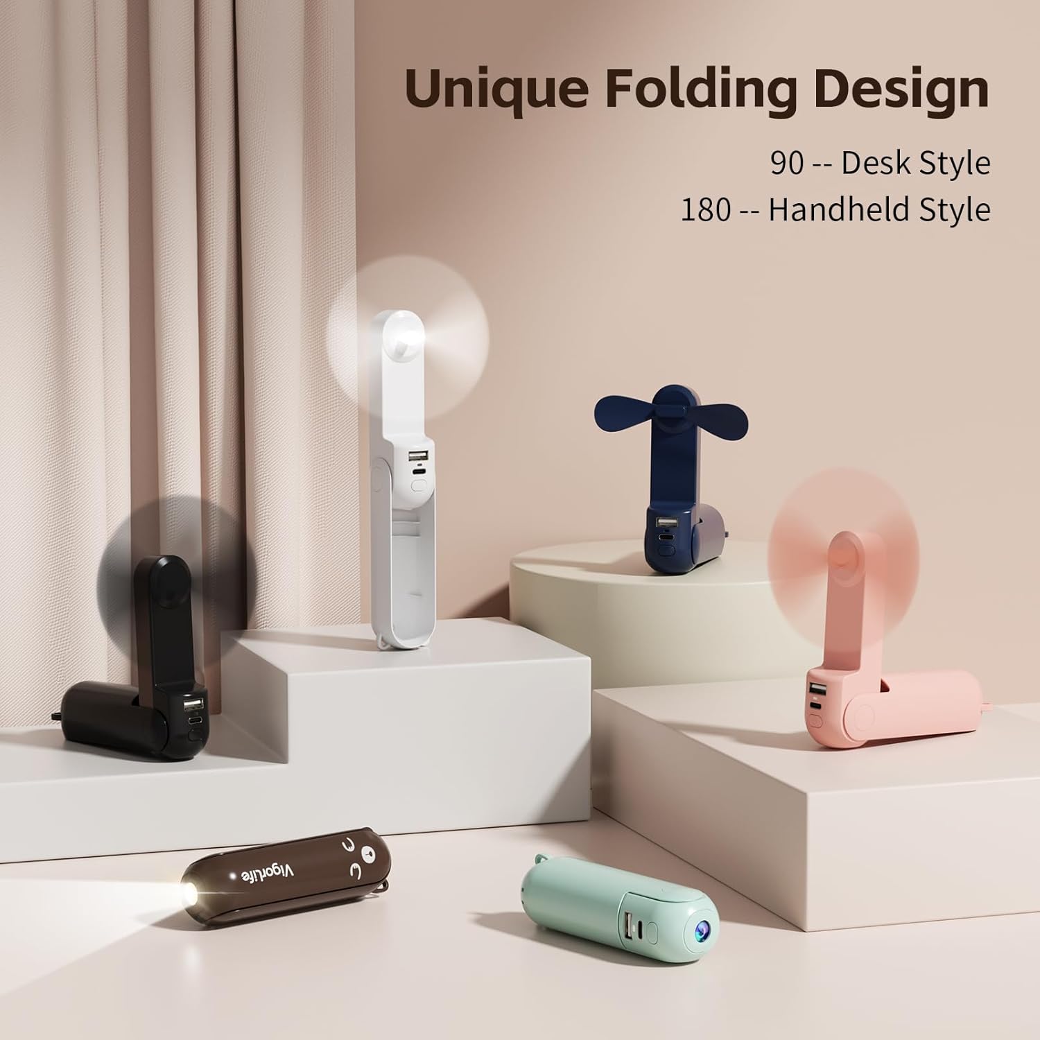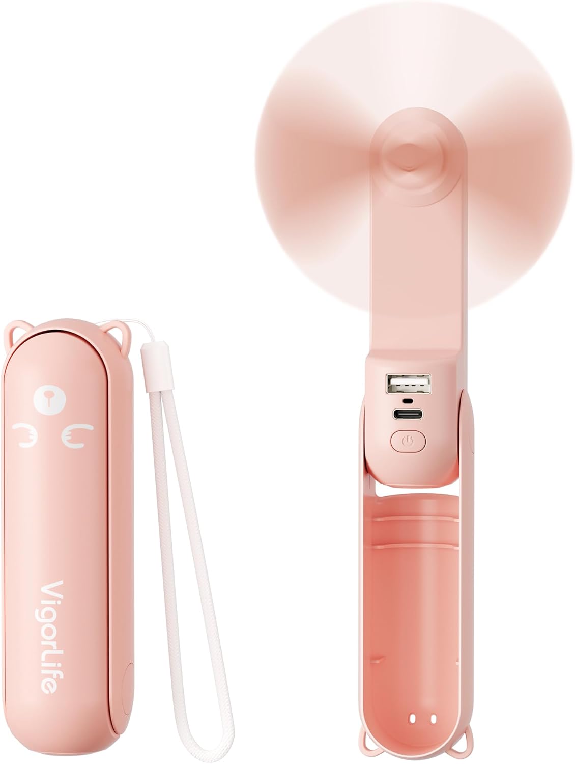 【Portable and fashionable design】Foldable pocket fan with hidden blades for easy storage. It can be used as a handheld fan by folding 180° and as a desktop fan by folding 270°.The thin fan can seamlessly switch between handheld portability and stable desktop mode. The portable fan adopts a cute bear shape design and pocket-sized design, and comes with a lanyard for easy carrying. It can be easily put into customer’s hand or bag, suitable for indoor and outdoor use. It will become customer’s essential companion for travel.
