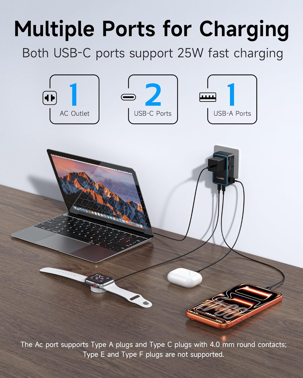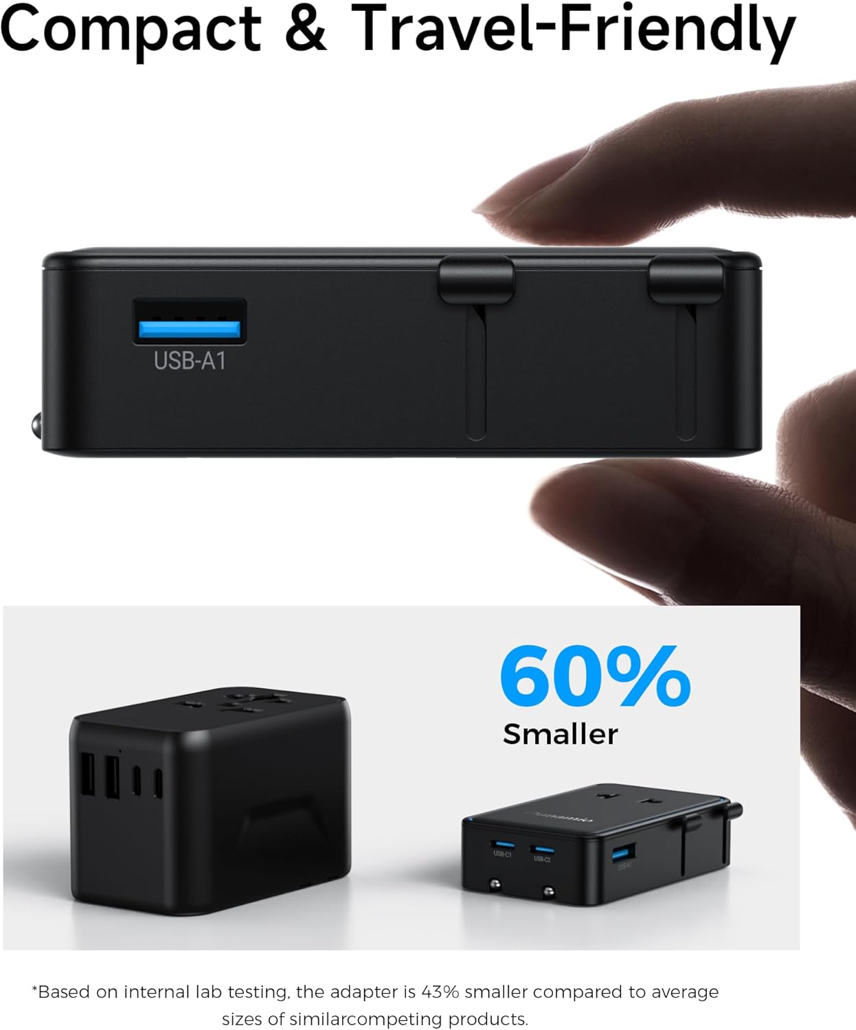 International Plug Adapter with USB C: The USB C1/C2 provide charging speed up to PD 25W max single, saving your time at airport or hotel; USB A port feature 18W max, 2 types of USB ports meet different charging needs.