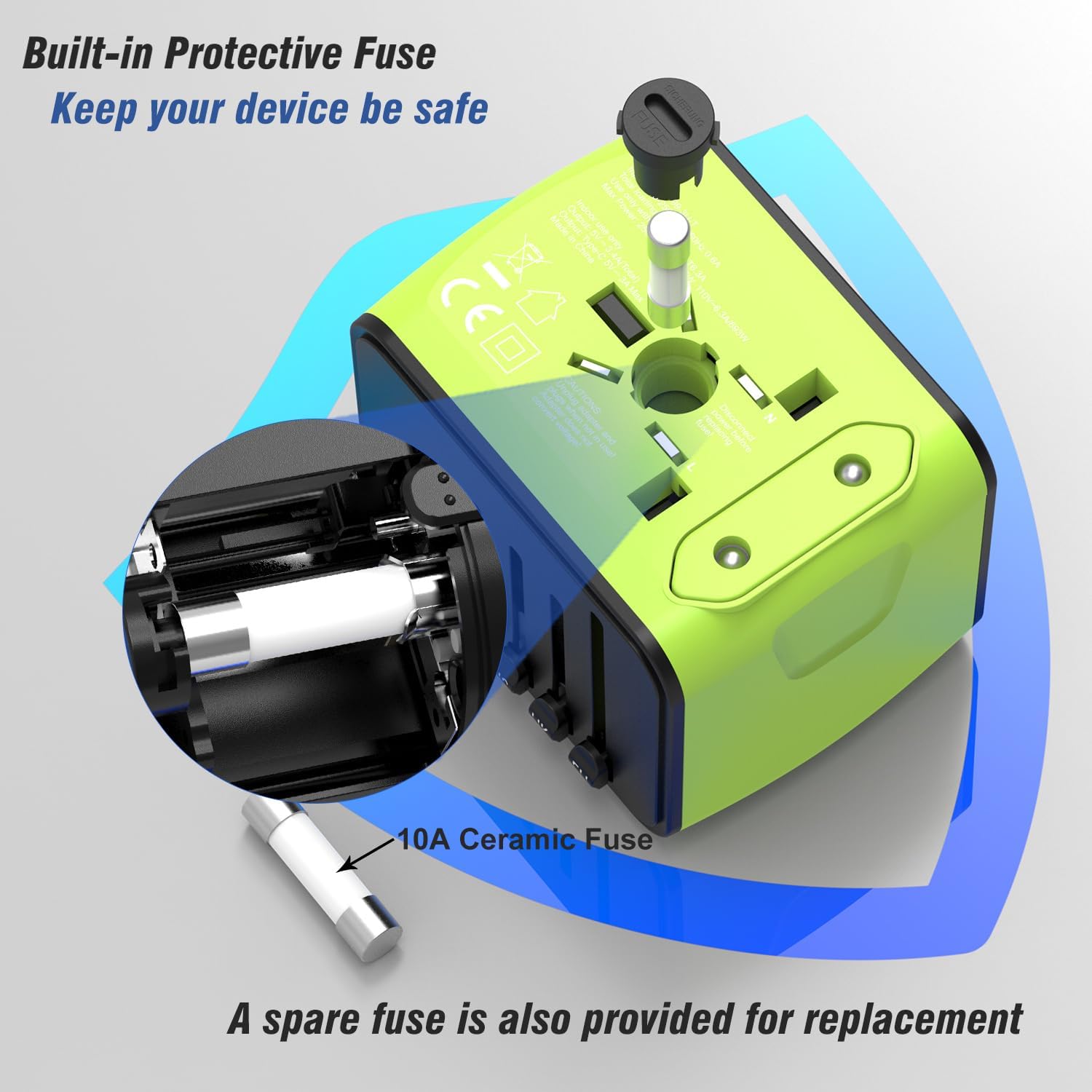 Portable and Safety: This international travel plug adapter is made of high quality flame retardant material, certified by FCC, CE and RoHS etc., safety design:integrated security shutters and separate plug lock system. Built-in 10A Fuse.