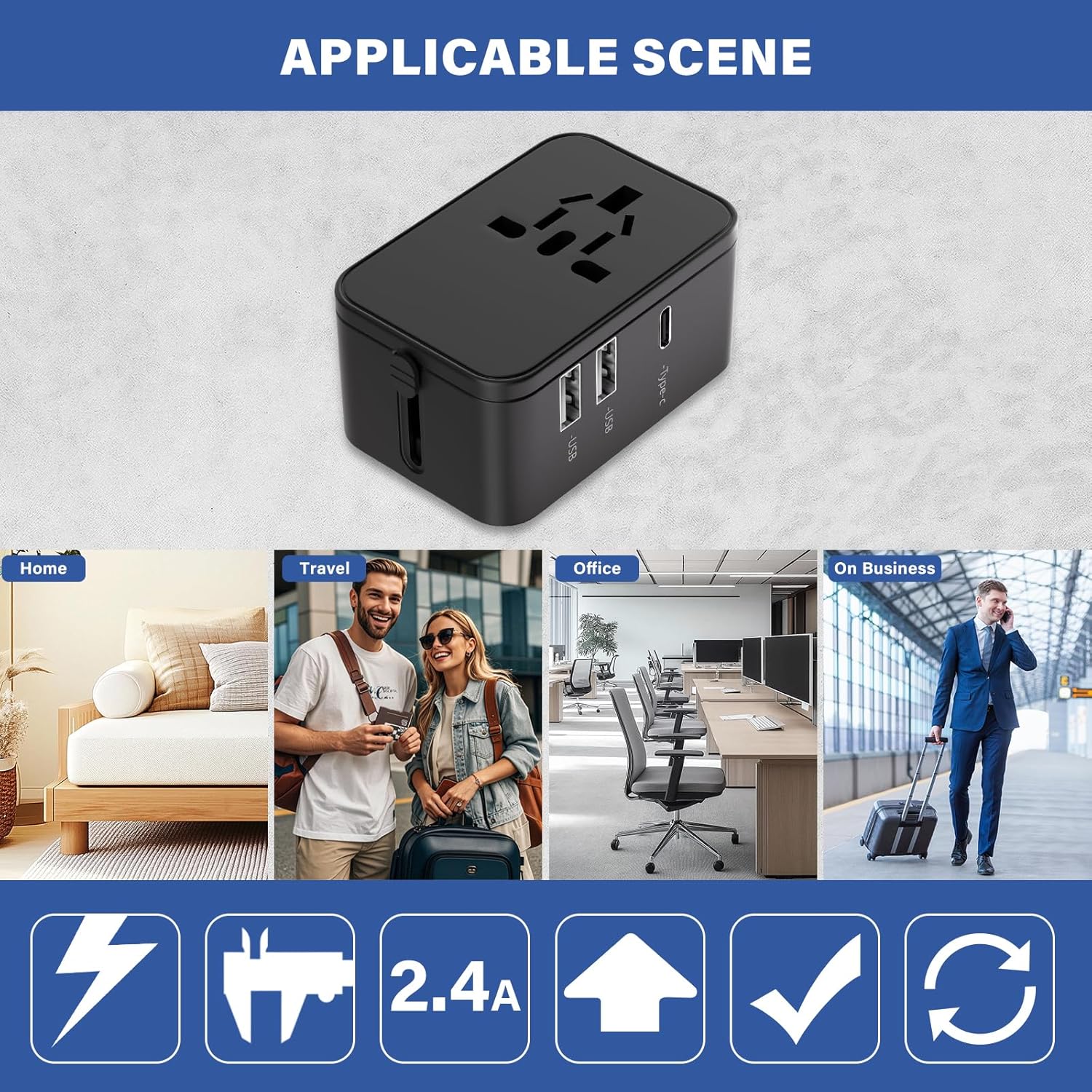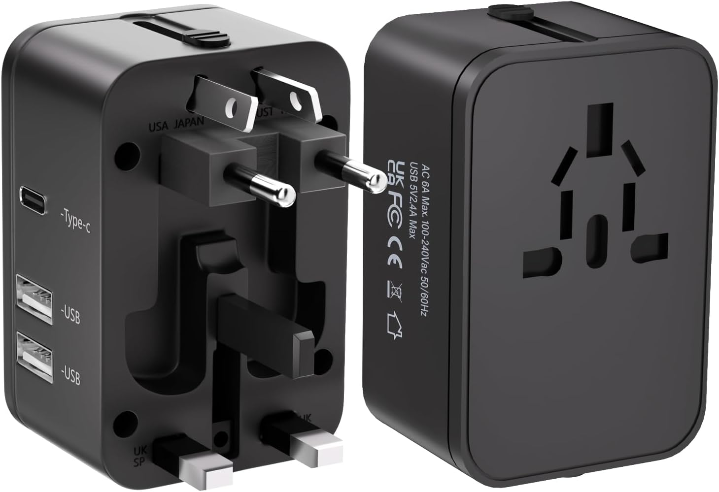TRAVEL CHARGER FOR MULTIPLE DEVICES: International adapter with 1 universal AC port, 1 USB-C ports(Output:5V 2.4A,12W), 2 USB-A ports(Output:5V 2.4A,12W). World plug adapter compatible with almost all USB Devices such as Huawei, Samsung, Apple IPone, Xiaomi and other Android phones, smart watch, ear phones, tablet, power bank, camera, game console and so on.