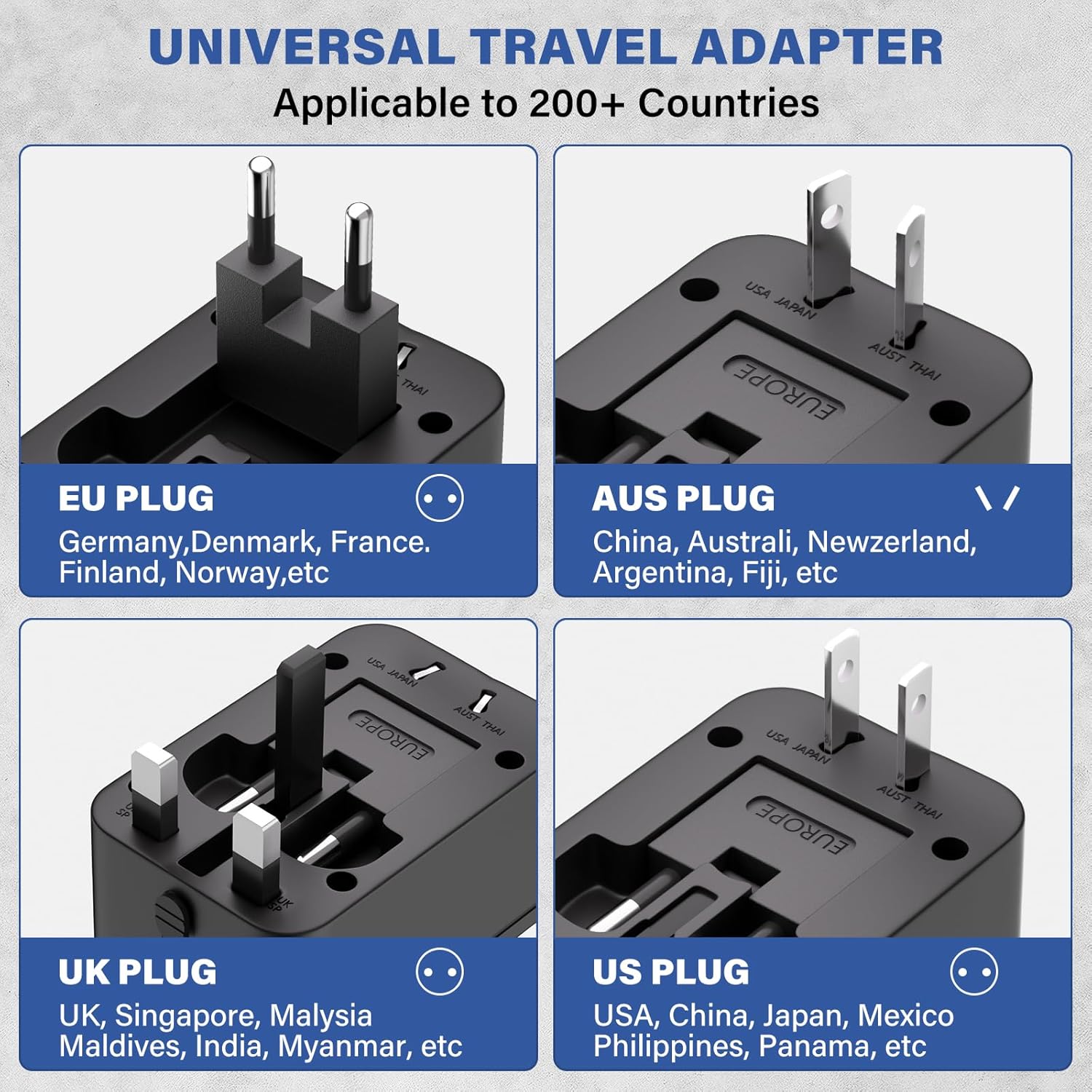 UNIVERSAL TRAVEL PLUG ADAPTER: EFISH travel adapter covers over 200 countries, includes Type A(US), Type C(EU), Type G(UK), Type I(AUS) plugs. Suitable for outlets in Thailand, New Zealand, Israel, Italy, Rome, France, Spain, Canada, China, Australia, India, Hong Kong, Argentina, Peru, Korea, Asia, etc.