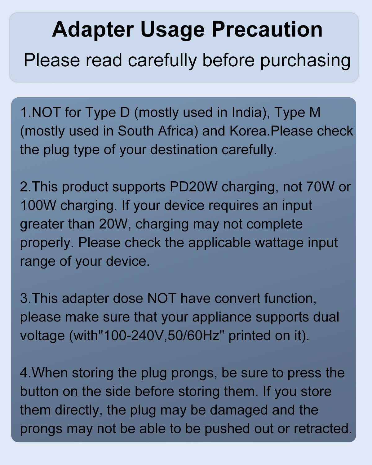 [Compact Design] You could slide out the pins for use and press the button on the side to recall the pins. After you recall the pins, the adapter could be pack as small cube(size: 7.6*5.3*5.9cm, weigh: 148g). So it’s portable to pack into backpacks or suitcases. The hard external PC case can protect the device inside in case of dropping.When storing the plug prongs, be sure to press the button on the side before storing them. If you store them directly, the plug may be damaged and the prongs may not be able to be pushed out or retracted.