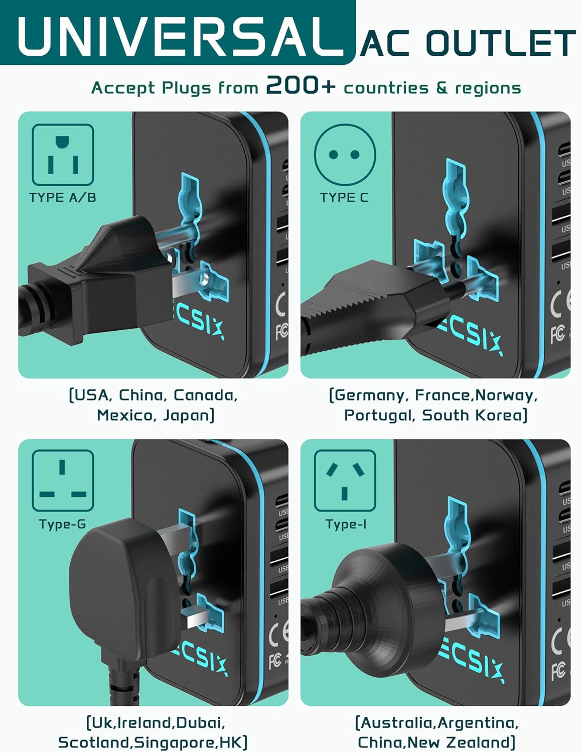 Universal Adapter for Travel: With 4 types of plugs, the travel adapter works in 200+ countries and regions. Type C: France, Germany, Italy, Spain and most of Europe; Type G: Dubai, England, Ireland, India, HK, etc; Type I: Australia, China, New Zealand, etc; Type A: USA, Canada, Japan, etc. Forget carrying multi plug adapters – all you need is one TECSIX all-in-one travel adapter!