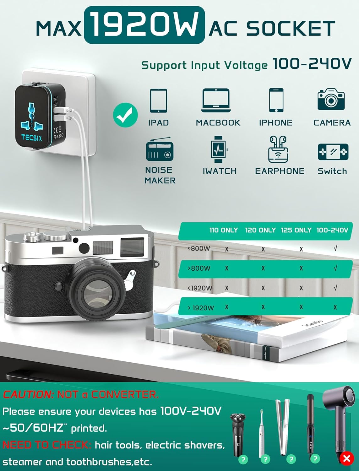 Max 1920W AC Power: This travel power adapter supports up to 880W at 110V and 1920 at 240V. Does not convert voltage. Not suitable for high-power appliances like hair dryers. Ensure your appliance supports dual voltage (100-240V). Quiet operation ensures peaceful charging.