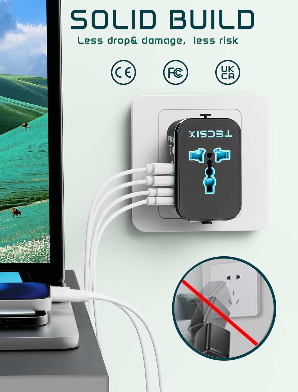 Safe & Smart Charging: With 8 built-in safety protections, including overcharge, overvoltage, and overload safeguards, this adapter features 2 x 8A fuses and fireproof materials. FCC, CE, and RoHS certified to protect your devices while automatically boosting charging speed.